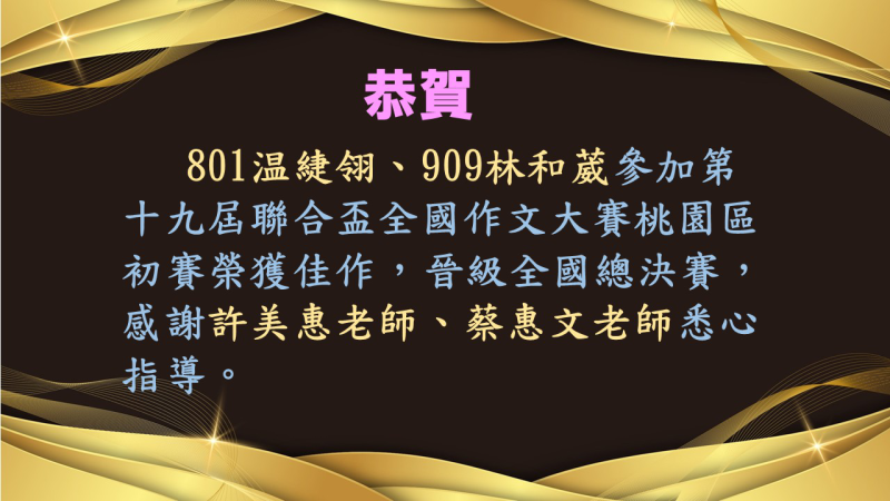 賀本校801温緁翎、909林和葳參加第十九屆聯合盃全國作文大賽榮獲桃園區佳作,晉級全國總決賽。感謝許美惠老師、蔡惠文老師悉心指導。