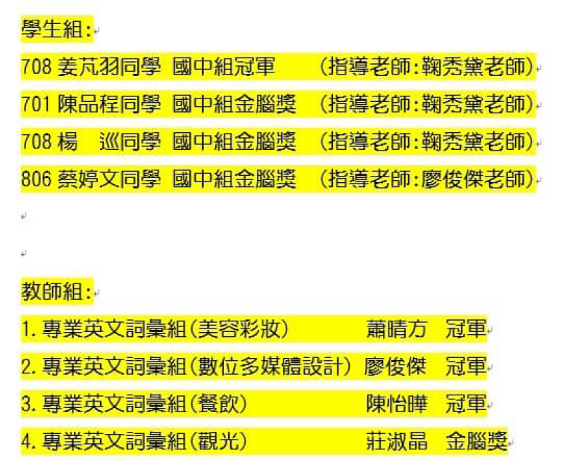 蕭晴方老師榮獲專業英文詞彙組(美容彩粧)冠軍廖俊傑老師榮獲專業英文詞彙組(數位多媒體設計)冠軍陳怡曄老師榮獲專業英文詞彙組(餐飲)冠軍莊淑晶老師榮獲專業英文詞彙組(觀光)金腦獎