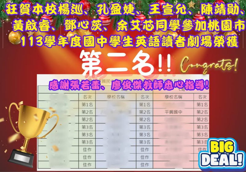 狂賀本校楊巡、孔盈婕、王宣允、陳靖勛、黃啟睿、鄧心茨、余艾芯同學參加桃園市113學年度國中學生英語讀者劇場榮獲全市第二名感謝張若蕾老師、廖俊傑組長悉心指導