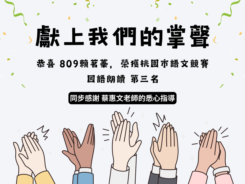 809賴茗蓁榮獲桃園市語文競賽榮獲國語朗讀第三名感謝蔡惠文老師悉心指導