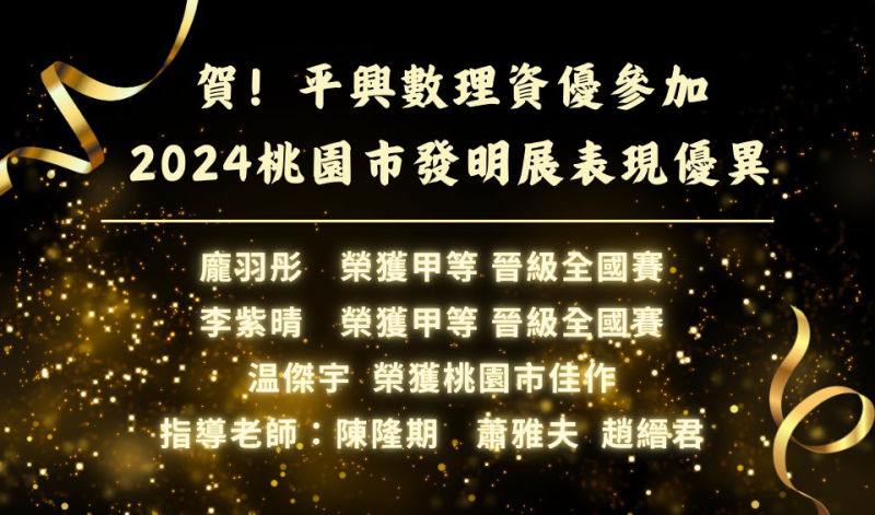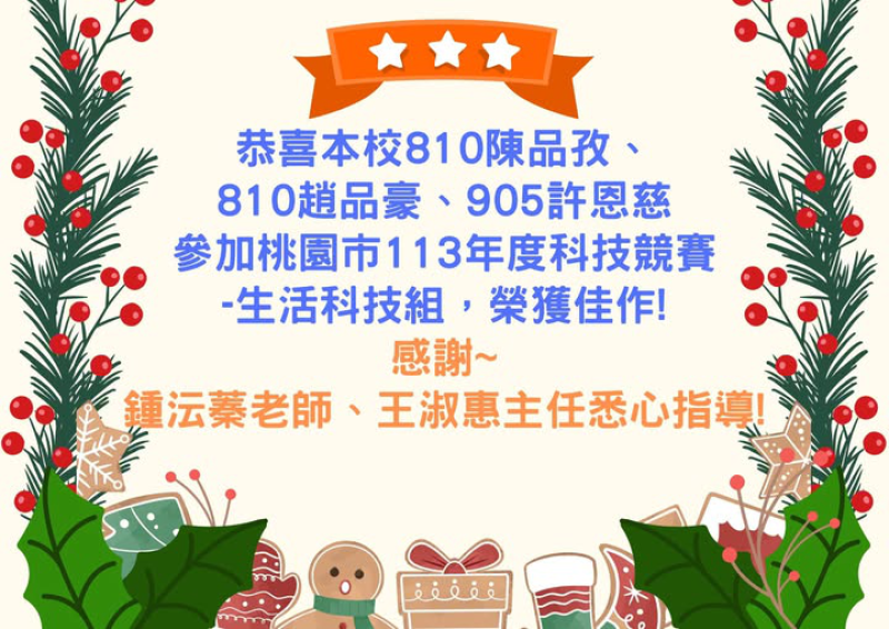賀本校參加桃園市113年科技教育創意實作競賽榮生活科技組佳作參賽學生810陳品孜、趙品豪,905許恩慈感謝指導老師鍾沄蓁老師、王淑惠主任悉心指導